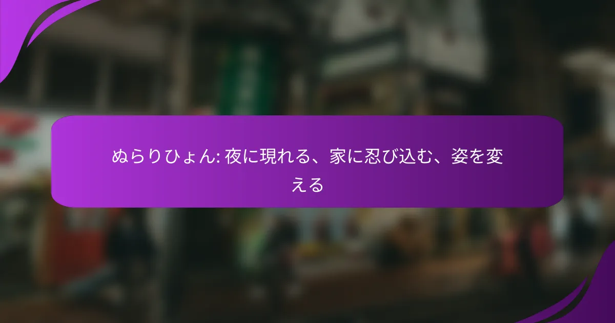 ぬらりひょんは、日本の伝説に登場する妖怪で、夜に家に忍び込む存在です。彼は姿を変える能力を持ち、人々の目を欺いて様々な形で現れることが特徴です。特に深夜から明け方にかけて活発になり、静かに侵入することで知られています。
